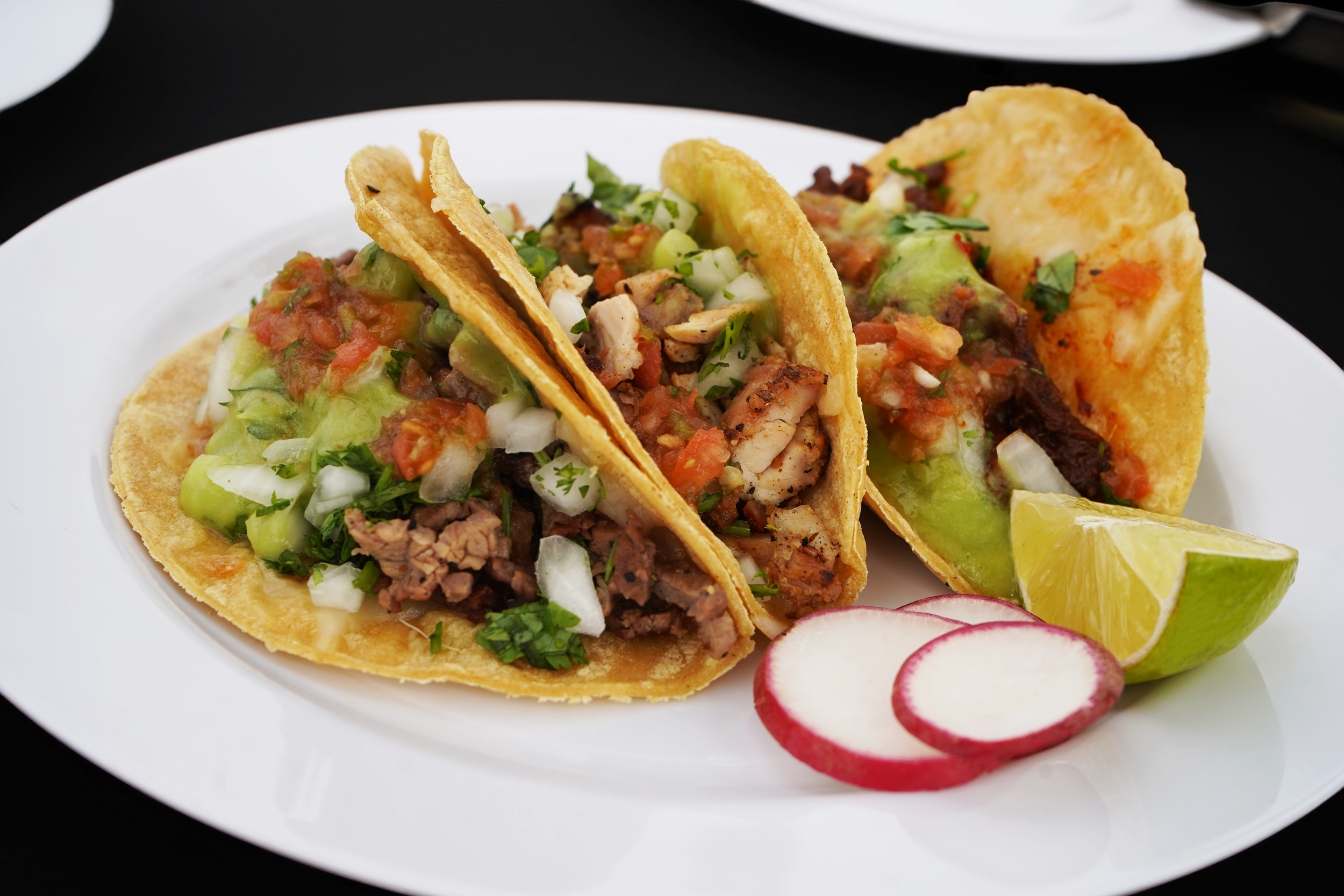 Corn Tortillas, Cilantro, Onion, Avocado, Red and Green Salsa, Cactus, Radishes and Limes.